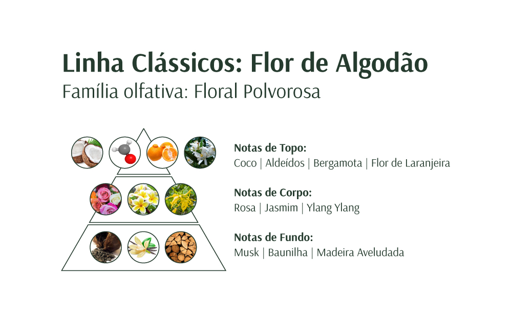 Os Sabonetes em Barra da linha Clássicos são veganos, sem parabenos, e proporcionam limpeza e hidratação. A fragrância Flor de Algodão é floral polvorosa, com notas de coco, bergamota, ylang ylang, e baunilha.