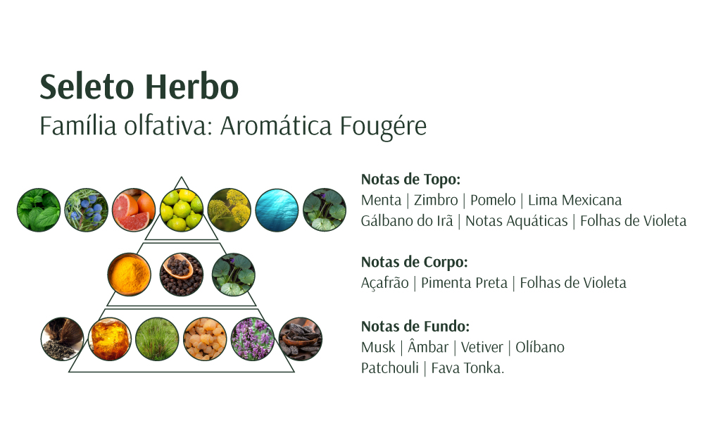 A linha Seleto Herbo foi desenvolvida como um desdobramento olfativo da fragrância Seleto para explorar a essência aventureira e entusiasmada dos homens. Os produtos da linha oferecem uma combinação única de nuances cítricas, aquáticas e balsâmicas, finalizados com musk e especiarias frescas. Seleto Herbo é a escolha ideal para homens de espírito livre que enfrentam novos desafios com confiança e elegância.