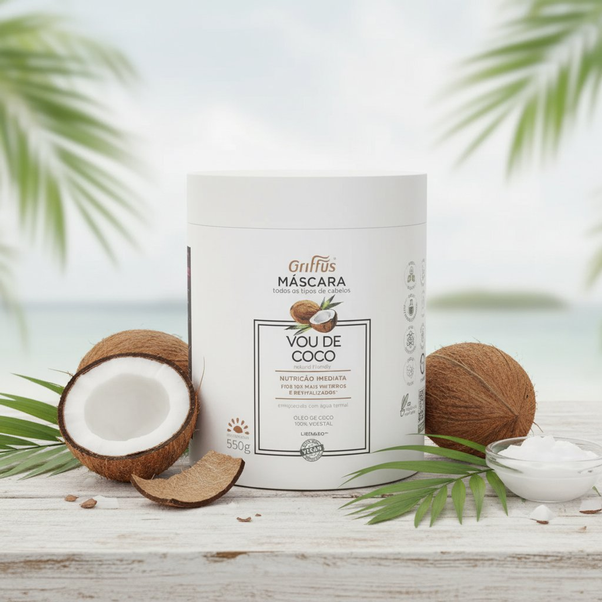 A Máscara Vou de Coco Griffus é o tratamento nutritivo que faltava para os seus fios.