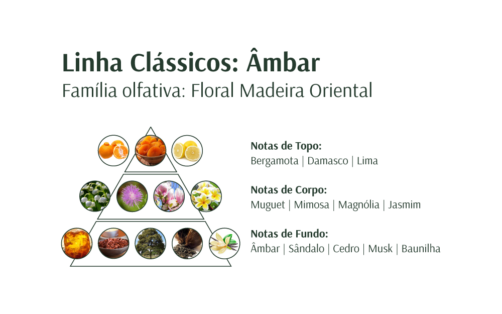 Âmbar é uma experiência olfativa doce e terrosa que captura a essência da elegância. Esta fragrância floral amadeirada oriental envolve o ambiente em uma atmosfera agradável com aspecto de requinte e sofisticação.