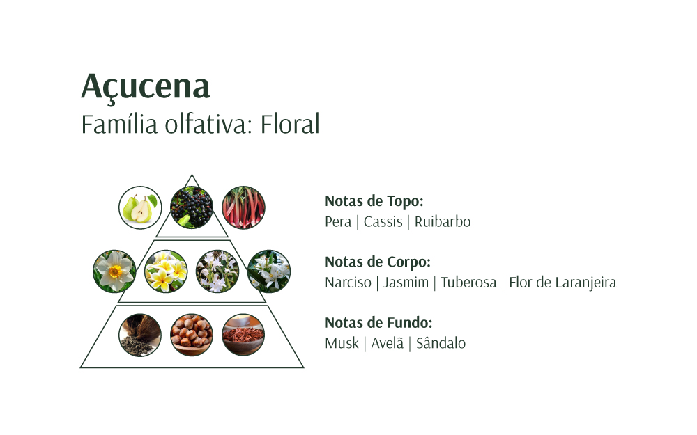 A flor Açucena inspira o nome e a fragrância dessa linha que é expressão de glamour e elegância. Ela é formada por deo colônia, gel de banho, creme acetinado hidratante corporal, óleo de banho, desodorante antitranspirante e deo colônia em versão roll on. Sua fragrância floral, fresca e delicada ilumina a rotina de mulheres que são movidas pelo romantismo e jovialidade.