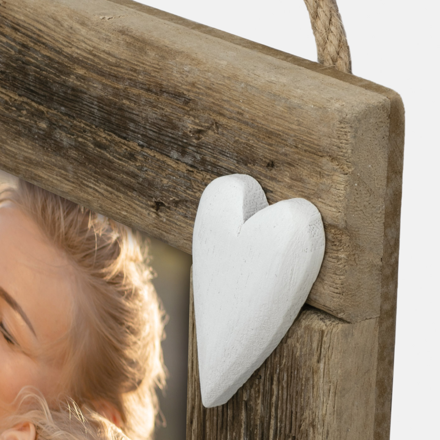 Moldura de madeira Essence 2Q, marrom, com efeito vintage e decoração em formato de coração branco, ideal para pendurar na parede com até 2 fotos. Perfeita para casa e escritório, uma ótima opção de presente original.